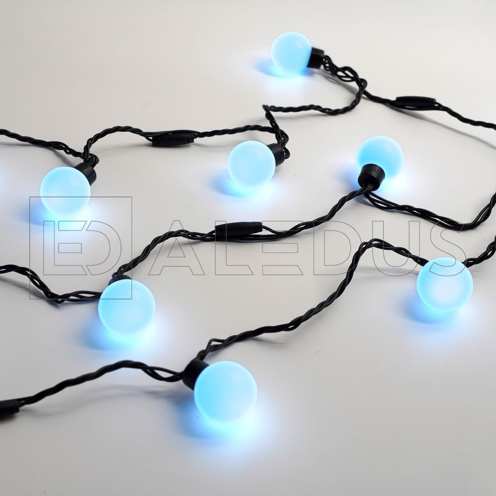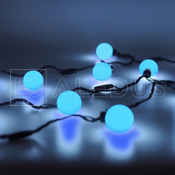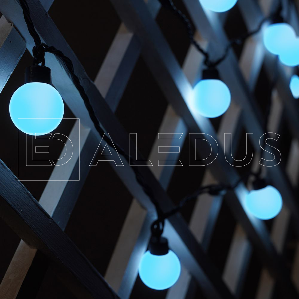 Гирлянда с шариками ALEDUS с синим свечением - это чёрный шнур ПВХ длиной 5метров. На котором через каждые 25 см. расположены светодиоды синего цвета под насадками в виде шарика диаметром 38 мм. Они полностью проклеены и обеспечивают безопасность использования гирлянды. Температурный режим применения от -25 до +45 ⁰С, что позволит создавать уют не только дома, но и на улице.