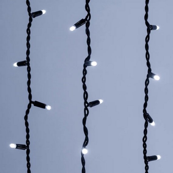 Светодиодная гирлянда занавес ALEDUS или Светодиодный дождь подходит для украшения домов, оформления витрин магазинов, окон кафе и ресторанов. Гирлянда типа Занавес имеет влагозащитный провод черного цвета, на котором размещены 200 светодиодов с влагозащитными колпачками белого свечения с эффектом мерцания. А лампочки распределены равномерно по всей площади гирлянды, так как расстояние между нитями и светодиодами на них - 10 см. Степень защиты гирлянды IP65 - позволяет использовать ее не только в помещении, но и на улице. Блок питания к гирлянде приобретается отдельно.